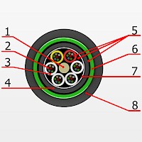 Tubes: the optical fibers are freely laid inside, and the free space is filled with a hydrophobic gel. Tubes are twisted around the central force element by the SZ-twist method. The free space between the twisted tubes is filled with gel and wrapped in a polyfilm. Then the inner sheath of polyethylene is imposed on the conductor, together with aramid or glass threads. An armor made of steel corrugated laminated tape and an outer shell made of high density polyethylene are placed on the cable covered with an inner shell. At the customer's request, a waterblocking thread or tape can be placed under the corrugated steel armor.